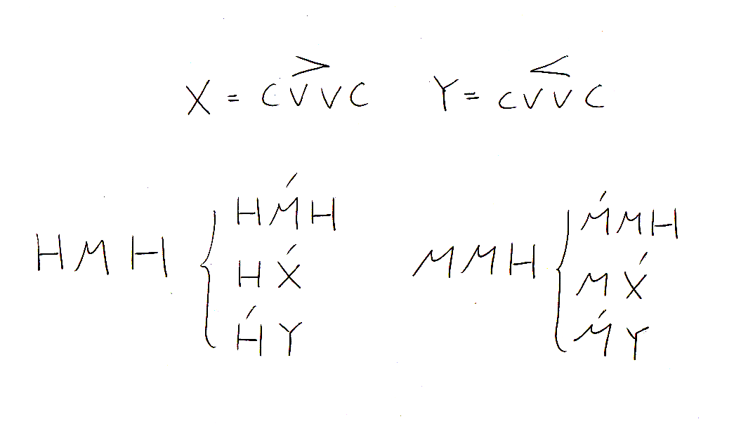 <アルカのアクセント> ・音の単位 単語、形態素、長音節、短音節、全モーラ、半モーラ、音素 おおむねこの順序で長い。 ただしnaのように形態素であり単語であるが、全モーラでしかないものもたくさんあるので、一丸には言えない。 アクセントの分析において重要なのは下記の4種。 長音節:CVCC, CVVCなどの長い音節。このうちCVCCをS(syllable)で表記 短音節:CVCからなるもので、Cはφでもよい。H(heavy)で表記 全モーラ:CVからなるもので、Cはφでもよい。a,ma,ka,taなど。M(medium)と表記 半モーラ:Cのみ。s,t,kなど。L(light)と表記 上記4種をアクサン素と呼ぶ。 ・カウント法 アクセントは単語の後ろから数える。 そのため、どんな長い単語があっても、後方のアクサン素のみに注目すればよい。 後ろから三位までのアクサン素をカウントすれば、アクセントの位置が判断できる。 ・アクサン表 後方から三位までのアクサン素を組み合わせた表。 右が一位で、左が三位。 表には見えないものの、三位の左が四位となる。 formula:アクサン素の組み合わせ式 variant:変異。置換基 ●アクサン表 ・第一法則 アクサン表は三位までだが、アクセントが置かれる変域は四位まで。 アクセントの付く位置は下記の通り。若い数字の法則が優先。 1:二位までのSにアクサン 2:二,三位のHにアクサン 3:三位のMにアクサン 4:二位のMにアクサン 5:四位にアクサン つまるところこの法則は「語末から少し離れたところにある最も大きな音節を探す」作業に等しい。 HLMはSMにはなるが、HSにはならない。 同じくMLHはMSにならず、MLMはMHにならない。 また、MMLはMHと捉えなおすこともできる。 そのため、MHの前にL,M,Hのいずれが来るかで、その後の振る舞いが変わる。例えばMMHやHMHが作られる。 ・第二法則 第一法則で篩えないのがHMHとMMH。これを篩うために第二法則が存在する。 末尾のMHがCV VCになるパターンは長音節を作る。main, kainなど。 この中の二重母音の強弱の関係を見ると、mainではa>iになっている。 >の流れのあるものを強音節と呼び、それ以外は弱音節と呼ぶこととする。 強音節は>の流れを持っているので、アクセントを置きやすい。 dainは前の母音が強く後ろの母音が弱いので、dAinにすると全体的に>の流れを持ち、強音節の>の流れに沿うため。 dainは>なのでアクサンを付けやすいが、dianは<なのでアクサンを付けにくく、dIanとなりにくい。 普段はこの差を意識しないが、hardianのような単語になってくると違いが出てくる。 強音節をXとし、弱音節をYとする。 XYを導入すると、HMHは以下の3種に分かれる。 1:HMH:har/dI/gan:HMHの基本法則に基づき、Mにアクサン。armalet, artalesなども同様。 2:HX:har/dAin:Xにはアクサンを付けやすいのだから、Xにアクサン。 3:HY:hAr/dian:Yにはアクサンを付けにくいので、前の音節にアクサンを繰り上げる。iの後ろのaにアクサンを置いたら元も子もない。弱と強に分けた意味がなくなる。 同じようにMMHについて。 アルカではAmalis, Atolas, agEit, kAmian, rIdianのようになるが、これらも篩うことができる。 1:MMH:A/ma/lis, A/to/las:法則どおりM1にアクサン。 2:MX:a/gEit:Xにアクサン。elEinなども同様。 3:MY:kA/mian, rI/dian:前の音節にアクサンを繰り上げる。 ちなみに、amaiはMXではない。Xの定義はCVVCだし、そもそもMMMになってしまう。MMHの仲間ではない。 同じくariaもMYではない。MMMであって、MMHの仲間ではない。 ●第二法則表 ・外国語による例外 例えばルティア語のアクセントは語末にあるため、しばしばルティア語から入った語にはこの法則が適応されない。 あくまでこの法則はアルカ固有の語についてのものにすぎない。 ・意味による例外 kanxionもarxionもHYで、法則からいけばkAnxionやArxionになるはずだが、kanxIonやarxIonのほうが自然である。 これは意味のせいである。カン(父)・シオン(紫苑)、ar(神)・シオン(紫苑)だと脳が思っているため。 もしこれが意味のないレンピオンだったら、lEnpionと発音されることだろう。 ・幻日と例外 例外には幻日では[アクセント]タグが付いている。 anfelixionのように社会的階級によってアクセントを付ける位置が異なることもあり、文化の豊かさを感じる。 ・アプリオリのアクセント体系 アルカのアクセントは音節とモーラで法則を作る。 音節だけで考えるとラテン的になるし、モーラだけで考えると日本的になる。どちらにしてもアルカの音声は篩えない。 しかしこの法則だときちんと篩える。揺れがない。 <幻日と外国語のアクセント> アクセントを仮に大文字で示すと、日本語で着物はkimonOに近いが、英語だとkimOnoのように発音される。 このとき、英和辞典のアクセント欄にはkimonOでなくkimOnoが書かれることとなる。 これは英和辞典が英語の辞書であることからも当然で、英語の辞典は日本語のアクセントまでは保証しない。 幻日にも同様なことが言える。 elyunditeはルティア語から来た単語で、アクセントはelyundIteである。ところが本来のルティア語ではelyunditEである。 ルティア語は拘束アクセントなので元はelyund