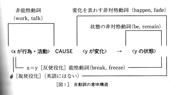 能格動詞は反使役化動詞と同じものという扱いになっている。反使役化動詞とは「他力または自力によって変化する」動詞とあり、脱使役化動詞とは「他力の存在を陰に隠して、対照の変化のみを表す」動詞とある。